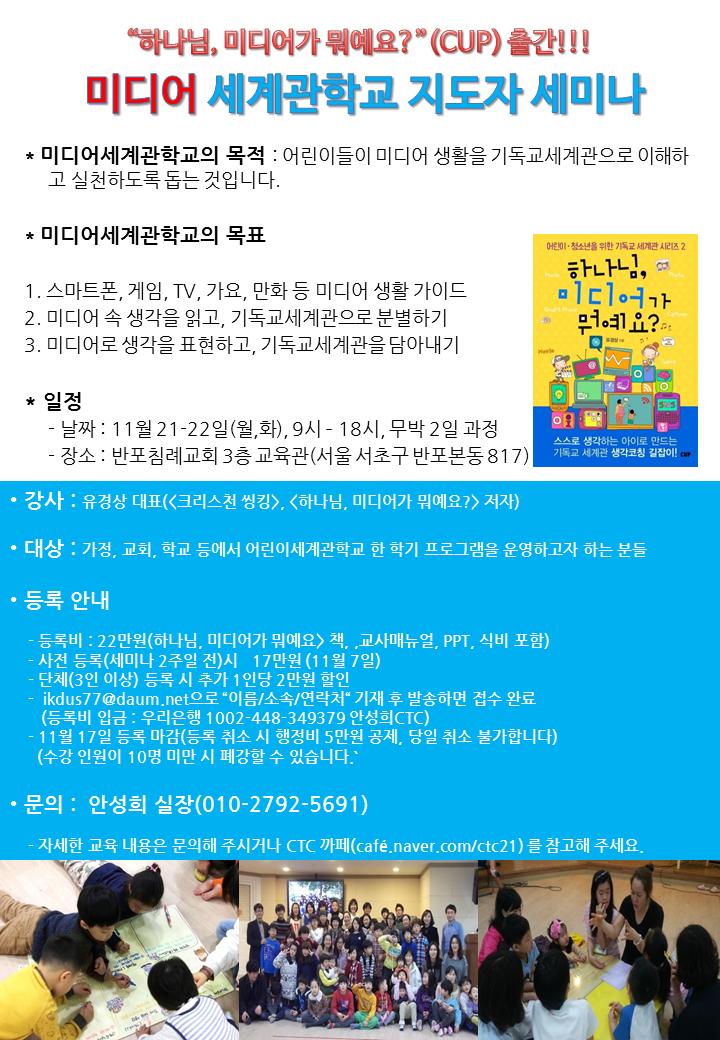 - 등록비 : 22만원 (<하나님, 미디어가 뭐예요> 책, 교사 메뉴얼, PPT, 식비 포함)